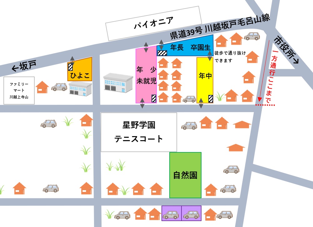 近くのパイオニア川越工場の社員駐車場をお借りしています。近隣にご迷惑をお掛けすることのないようお気を付けてお使いください。自転車の方は、駐車場内の駐輪場スペースに置いてください。